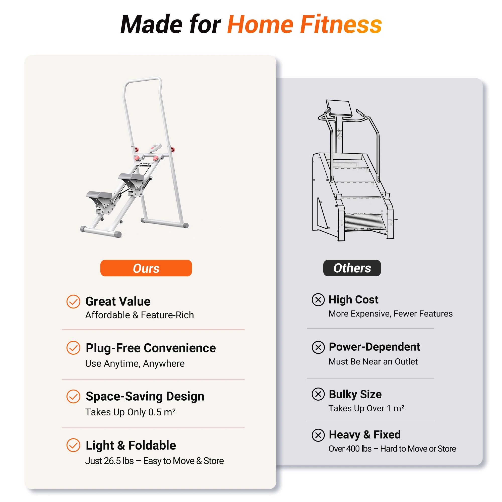 This stair stepper machine is designed to target the glutes while delivering an effective full-body cardio workout. The vertical stepping motion engages the legs, hips, and core, while the built-in handrail adds stability and confidence during training. Ideal for home use, it supports consistent movement, strength, and endurance.